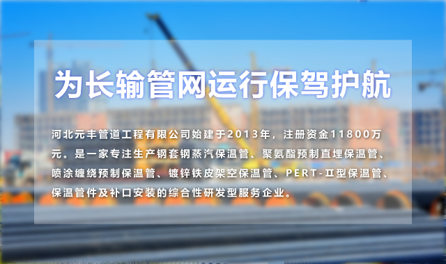 河北元豐管道工程有限公司始建于2013年,注冊資金11800萬元。是一家專注生產鋼套鋼蒸汽保溫管、聚氨酯預制直埋保溫管、噴涂纏繞預制保溫管、鍍鋅鐵皮架空保溫管、PERT-Ⅱ型保溫管、保溫管件及補口安裝的綜合性研發型服務企業。